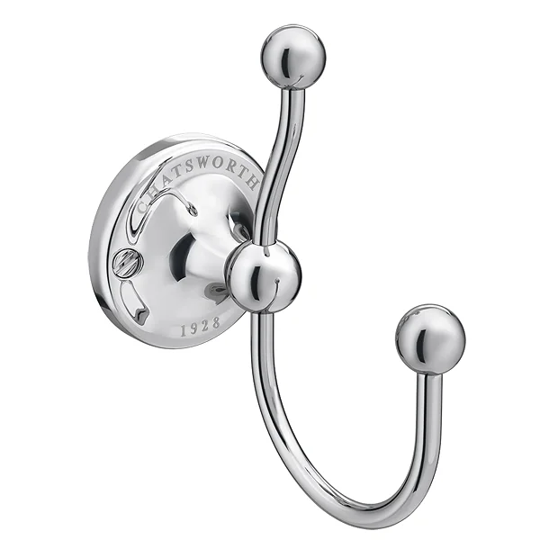This high quality traditional double robe hook has been manufactured to a very high standard by Chatsworth. The stunning Chrome finish makes this stylish hanging solution a beautiful practical feature. Minimal installation for maximum effect.