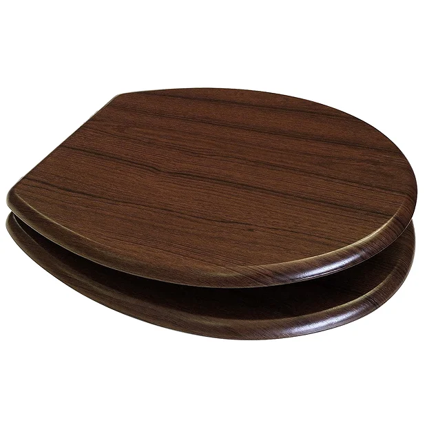 This toilet seat from Euroshowers is manufactured from a strong bond MDF and finished with an walnut wood effect printed veneer finish. The seat features chrome plated metal bar hinges, hinges are adjustable to fit holes on a toilet between 105mm – 205mm.