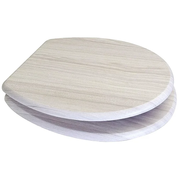 This toilet seat from Euroshowers is manufactured from a strong bond MDF and finished with an white ash wood effect printed veneer finish. The seat features chrome plated metal bar hinges, hinges are adjustable to fit holes on a toilet between 105mm – 205mm.