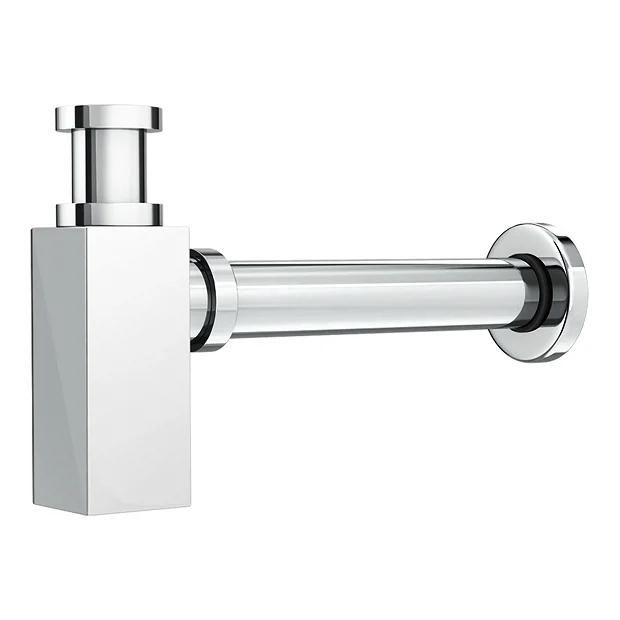 A modern square shallow basin bottle trap in chrome plated solid brass with wall pipe and a round wall flange. Perfect for giving a modern contemporary look at a real value for money price.
