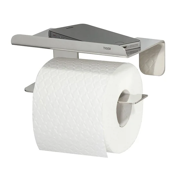 This toilet roll holder with shelf from the Tiger Colar range is stylish and completely on-trend. The integrated shelf offers practical storage space for toiletries or mobile phone. The Colar toilet roll holder can be mounted in its entirety with the supplied strong, double-sided 3M tape.