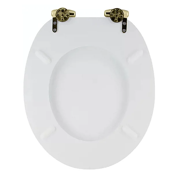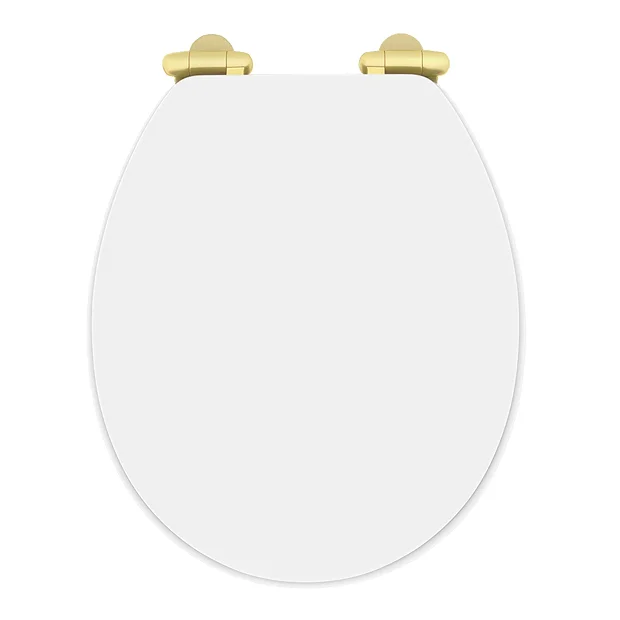 A high-quality heavyweight round white gloss wooden toilet seat with brushed brass plated soft close hinges. This MDF toilet seat comes with non-slip buffers.