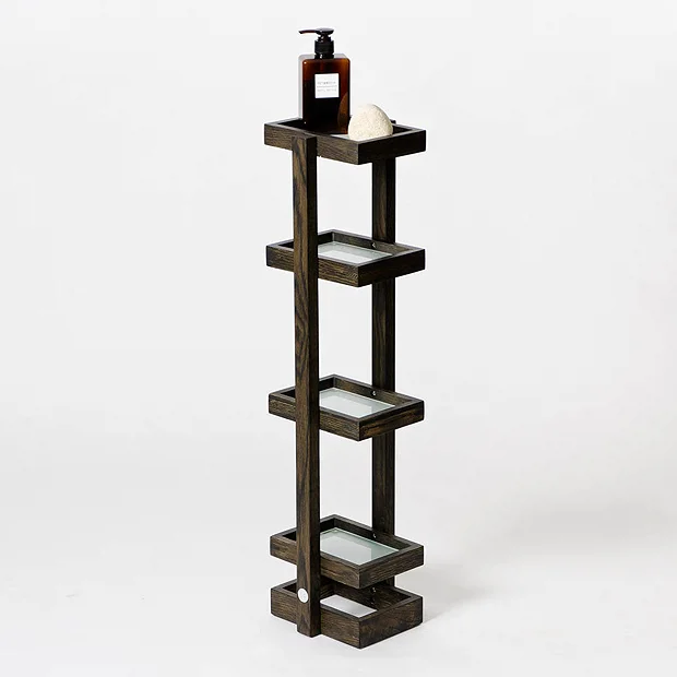 Keep all your toiletries and bathroom essentials organised with this freestanding shelving washstand. It features four frosted, tempered glass shelves that combine elegantly with a solid oak frame to provide the perfect solution for your storage needs. Beautifully crafted from white oak and oak veneers and finished with a dark stain water resistant lacquer. The silicone feet stop it from slipping and prevents your floor from being scratched.