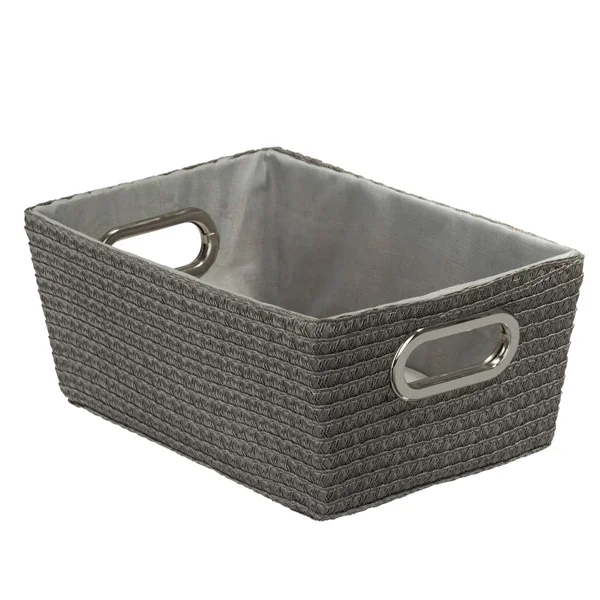The elegant yet simple design of this rectangular grey bathroom storage basket offers a charming alternative to extra shelving or cabinets for storage. Perfect for keeping toilet rolls in or all your cosmetics safe in one place. It features a stunning design of grey mesh work with a cotton interior and chrome handles at each end