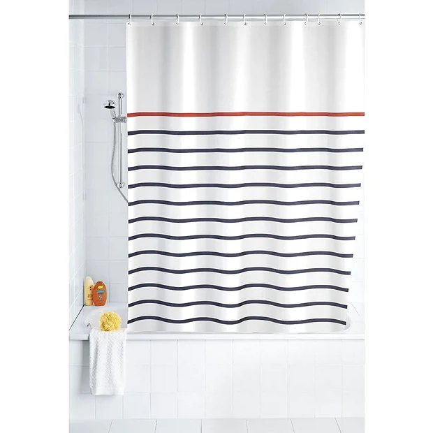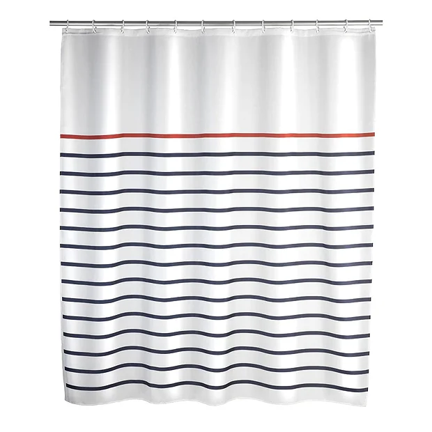 The Marine collection from Wenko features a nautical inspired theme and would make a stylish addition to any bathroom. This striped shower curtain has a width of 1800mm making it suitable for both showers and baths. Manufactured from 100% Polyester the curtain is washable whilst still maintining its waterproof properties. The bottom is weighted by an environmentally friendly rubber band instead of lead. 12 white shower curtain rings are also included.