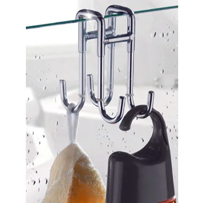 The practical Wenko Double Shower Hook, made of solid stainless steel. Designed for glass shower enclosures with a max thickness of 2cm, this stylish shower hook has 4 hooks which offer storage for shower utensils, sponges, towels, robes etc. Transparent plastic sleeves protect from hooks from scratches.